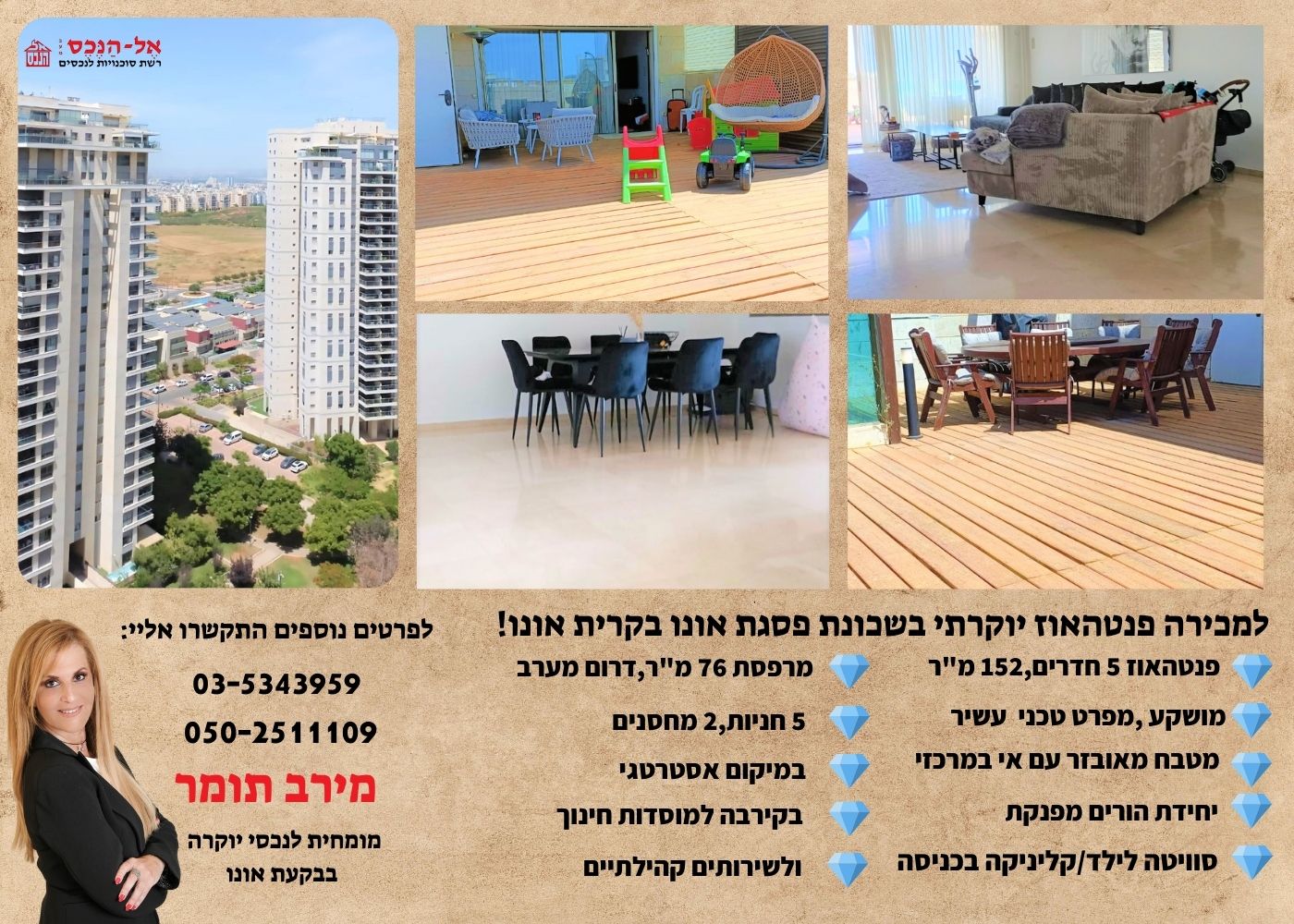 שכונת בפסגת אונו המבוקשת, פנטהאוז מרשים בקומה ה 20 הצופה לנוף מרהיב בכיווני דרום מערב. הפנטהאוז, בן ה 5 חדרים מתפרש על פני 152 מ"ר [כולל גם 2 מחסנים צמוד ותת קרקעי ] מרפסת הגג כוללת פרגולה ופינות ישיבה עם גישה נוספת למבואת המדרגות, בכניסה לדירה סוויטה/קליניקה , מטבח, יחידת הורים מפנקת , 2 חדרי שינה נוספים שאחד מהם ממ"ד וחדר רחצה נוסף. לפרטים נוספים ולביקור אישי: מירב תומר מומחית לנכסי יוקרה