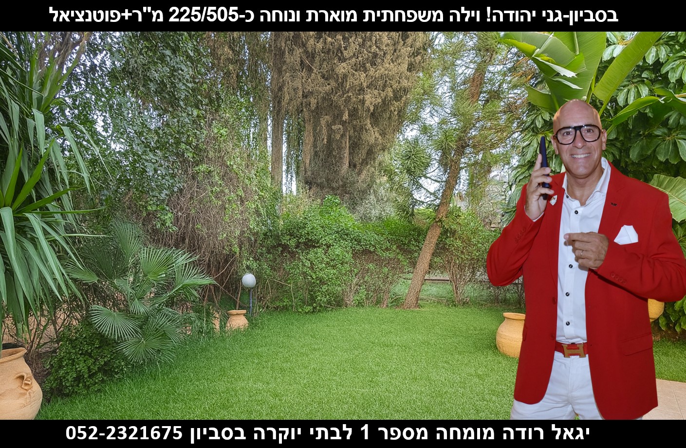 בסביון! בית במחיר של פעם ! רוצים להתעורר בבוקר לציוץ ציפורים וריח ירק רענן? סביון-גני יהודה ממתינה לכם וילה משפחתית קסומה, בתכנון חכם שזורם אל החוץ,עם סלון רחב ומואר הנפתח אל גינה פסטורלית וירוקה.הבית מציע פוטנציאל אינסופי להגשמת חלומותיכם ומעניק תחושת מרחב,שלווה ואיכות חיים שלא תמצאו בשום מקום אחר,בקרבה לשירותים קהילתיים באווירה כפרית,כאן משפחתכם תפרח.לפרטים ולסיור אישי:יגאל רודה אוהב את העבודה לשירותך,מומחה מספר 1 בסביון 052-2321675